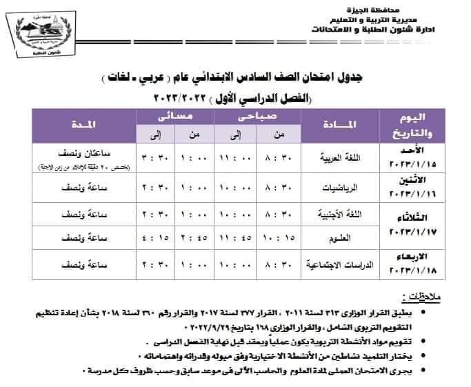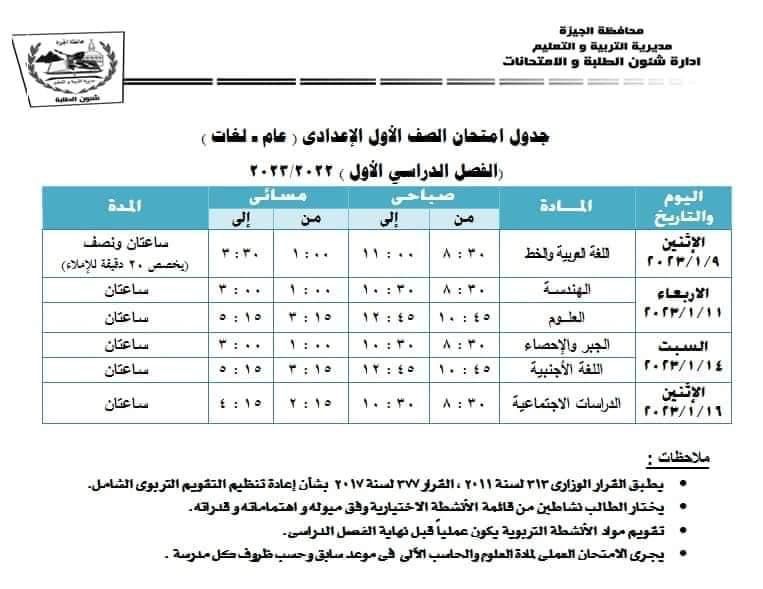 اعتمد اللواء أحمد راشد محافظ الجيزة، وأشرف سلومة وكيل وزارة التربية والتعليم بالجيزة، مواعيد امتحانات الفصل الدراسي الأول " نصف العام" للعام الدراسي 2023/2022 وفقًا للمواعيد التالية: -