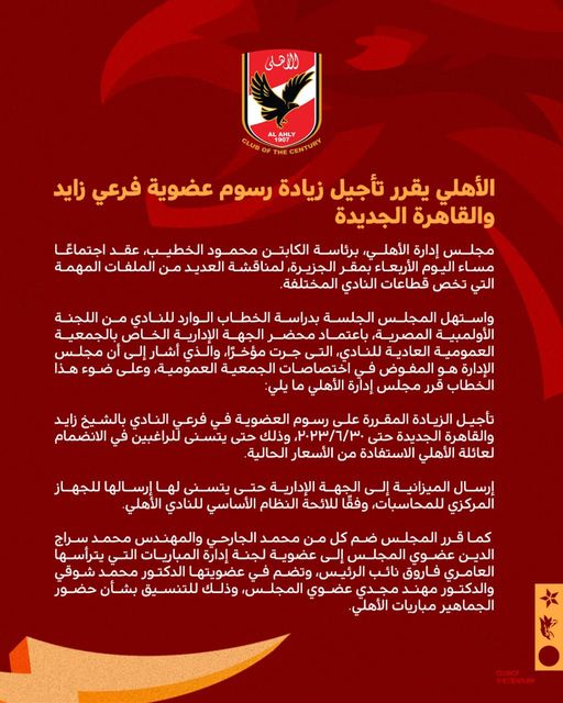تأجيل الزيادة المقررة على رسوم العضوية في فرعي النادي بالشيخ زايد والقاهرة الجديدة حتى 30/6/2023، وذلك حتى يتسنى للراغبين في الانضمام لعائلة الأهلي الاستفادة من الأسعار الحالية.