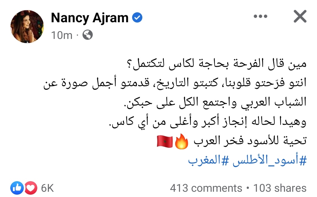 دعمت الفنان نانسي عجرم لاعبى المنتخب المغربي، بعد هزيمته من المنتخب الفرنسي بهدفين نظيفين فى المباراة التى جمعتهم بنصف نهائي كأس العالم 2022 المقامة فى دولة قطر الشقيقة.