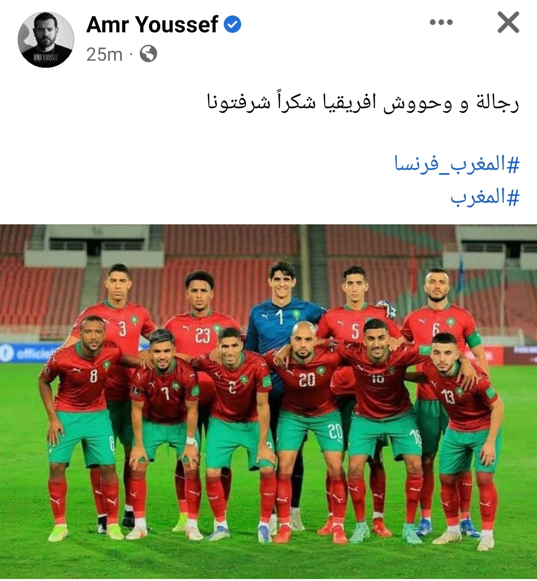 دعم الفنان عمرو يوسف، المنتخب المغربي بعد أدائه المشرف أمام المنتخب الفرنسي.