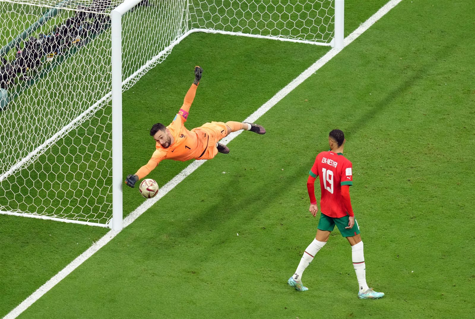 وفي الدقيقة (44) تصدى القائم الأيمن لمنتخب فرنسا لكرة قوية من منتخب المغرب بعد ركلة ركنية أولى للمغرب على يسار مرمى فرنسا، نفذها حكيم زياش بعرضية إلى داخل منطقة الجزاء تعامل معها الدفاع بارتباك شديد لتصل بالنهاية لجواد الياميق الذي سدد كرة مباشرة رائعة بركلة خلفية مزدوجة ارتدت من القائم الأيمن لمرمى الحارس هوجو لوريس.