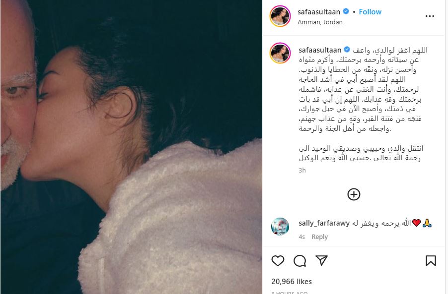 أعلنت الفنانة الأردنية صفاء سلطان وفاة والدها، ونشرت صورة جمعتها بوالدها الراحل، عبر صفحتها على موقع تبادل الصور والفيديوهات “إنستجرام”.