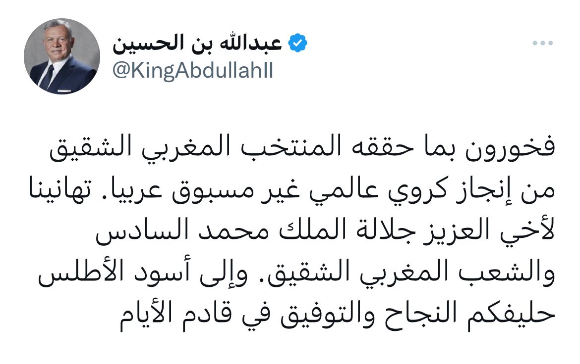وكتب الملك عبدالله الثاني تغريدة عبر حسابه الشخصي بموقع التواصل الاجتماعي "تويتر": "فخورون بما حققه المنتخب المغربي الشقيق من إنجاز كروي عالمي غير مسبوق عربيا"، مضيفاً،"تهانيا لأخي العزيز الملك محمد السادس والشعب المغربي الشقيق، وأسود الأطلس، حليفكم النجاح والتوفيق في قادم الأيام".