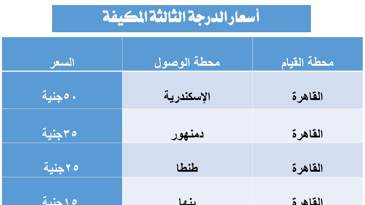 فى اطار حرص الهيئة القومية لسكك حديد مصر للعمل على توفير سبل الراحة للسادة الركاب وتحقيق أكبر قدر من التيسير عليهم وفقاً لما يتناسب مع تحقيق سياسة التطوير المنشودة قررت الهيئة تشغيل خدمة جديدة بعربات ثالثة مكيفة لخدمة ركاب محافظات الوجه البحرى وذلك يوم السبت الموافق 17 / 12 / 2022 وبيانها كالتالي..