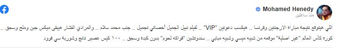 وحرص الفنان محمد هنيدي على دعم المنتخب المغربي، بعد هزيمته من المنتخب الفرنسي بنتيجة 2 بدون مقابل.