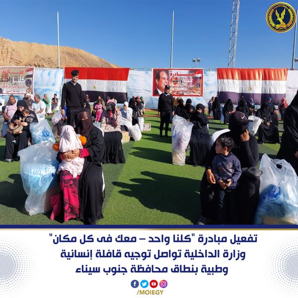 واصلت وزارة الداخلية فعاليات مبادرة "كلنا واحد ، معك فى كل مكان" رئيس الجمهورية لتخفيف العبء عن كاهل المواطنين من قاطنى القرى والمناطق الأكثر إحتياجاً حيث إضطلع قطاع حقوق الإنسان بوزارة الداخلية بالتنسيق مع القطاعات الأمنية والجهات المعنية بتوجيه قوافل طبية - إنسانية.