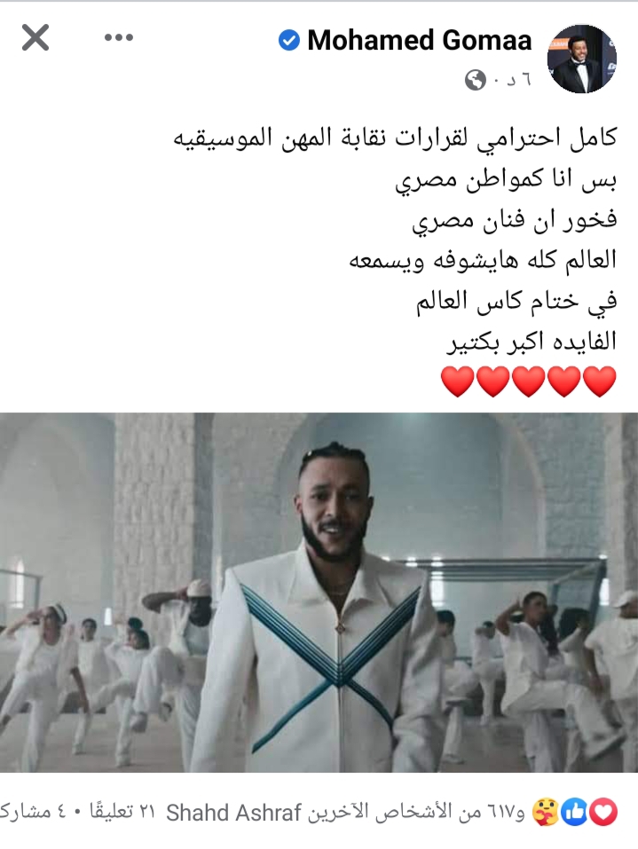 حيث نشر صورة ويجز وكتب:" كامل احترامي لقرارات نقابة المهن الموسيقية، بس انا كمواطن مصري، فخور أن فنان مصري، العالم كله يشوفه ويسمعه، في ختام كاس العالم، الفايده اكبر بكتير".