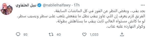 وكتب نبيل الحلفاوي في تدوينة أخرى، أضاف: "بجد بقى.. وبغض النظر عن الفوز في كل الماتشات السابقة.. الفريق لازم يعرف إن اللي عاوز يبقى بطل ما ينفعش يلعب على سطر ويسيب سطر.. لو ما كانش مستواه العالي ثابت يبقى ما يستاهلش بطولة.. وكولر النهاردة عليه عتاب".