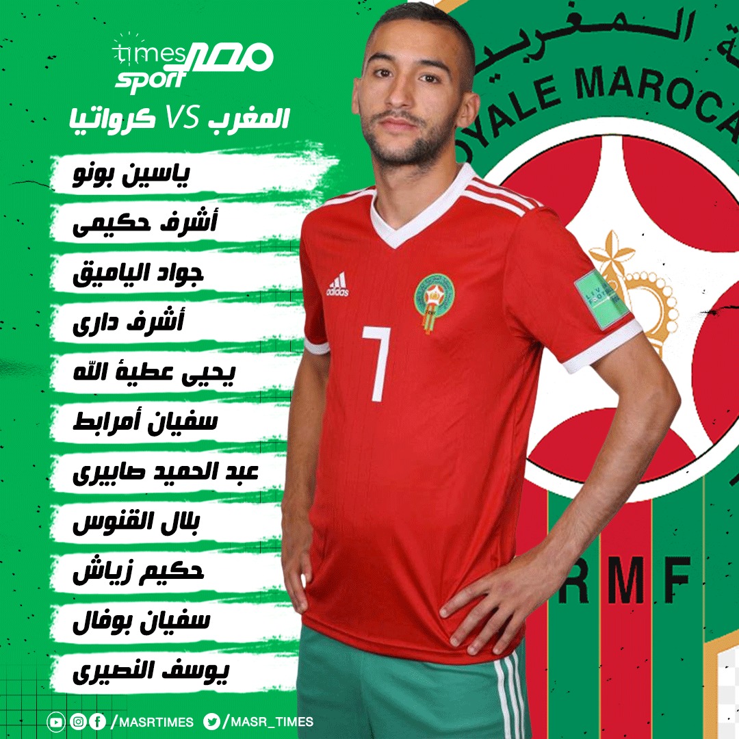 وجاء تشكيل منتخب المغرب ضد كرواتيا كالتالي: حراسة المرمي: ياسين بونو، خط الدفاع: أشرف حكيمي وجواد الياميق، أشرف داري ويحيى عطية الله، خط الوسط: سفيان أمرابط، عبد الحميد صابيري، بلال القنوس، حكيم زياش وسفيان بوفال، خط الهجوم: يوسف النصيري.