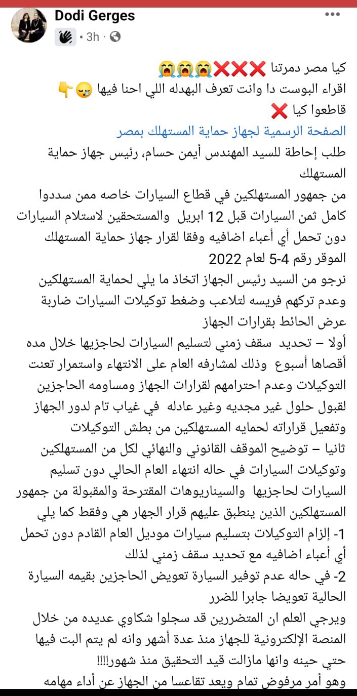 وقال العملاء فى بيان مشترك ،" طلب إحاطة للسيد المهندس أيمن حسام، رئيس جهاز حماية المستهلك من جمهور المستهلكين في قطاع السيارات خاصه ممن سددوا كامل ثمن السيارات قبل 12 ابريل والمستحقين لاستلام السيارات دون تحمل أي أعباء اضافيه وفقا لقرار جهاز حماية المستهلك الموقر رقم 4-5 لعام 2022 نرجو من السيد رئيس الجهاز اتخاذ ما يلي لحماية المستهلكين وعدم تركهم فريسه لتلاعب وضغط توكيلات السيارات ضاربة عرض الحائط بقرارات الجهاز.