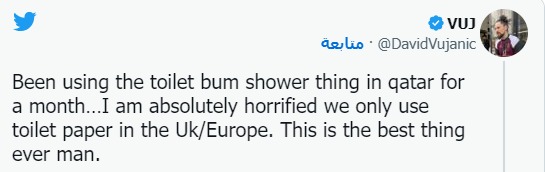 ونشر المشجع ديفيد فويانيك، تغريدة على حسابه الرسمي بتويتر، قال فيها: "كنت أستخدم أدوات المرحاض (الشطاف) في قطر لمدة شهر... أشعر بالرعب الشديد لأننا نستخدم ورق التواليت فقط في المملكة المتحدة/ أوروبا. هذا هو أفضل شيء على الإطلاق يا رجل".