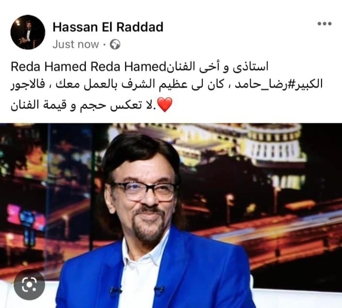 وكتب حسن الرداد، عبر موقع التواصل الإجتماعي "فيسبوك" قائلا: "أستاذي وأخي الفنان الكبير رضا حامد، كان لي عظيم الشرف بالعمل معك، فالأجور لا تعكس حجم وقيمة الفنان".