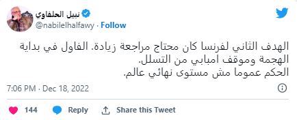 وكتب نبيل الحلفاوي عبر حسابه بموقع تويتر تغريدة قال فيها: "الهدف الثاني لفرنسا كان محتاج مراجعة زيادة. الفاول في بداية الهجمة وموقف امبابي من التسلل. الحكم عموما مش مستوى نهائي عالم".