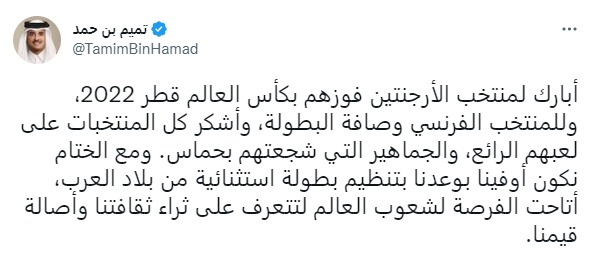 وقال أمير قطر عبر موقعه الرسمي على تويتر ،" أبارك لمنتخب الأرجنتين فوزهم بكأس العالم قطر 2022، وللمنتخب الفرنسي وصافة البطولة، وأشكر كل المنتخبات على لعبهم الرائع، والجماهير التي شجعتهم بحماس. ومع الختام نكون أوفينا بوعدنا بتنظيم بطولة استثنائية من بلاد العرب، أتاحت الفرصة لشعوب العالم لتتعرف على ثراء ثقافتنا وأصالة قيمنا.