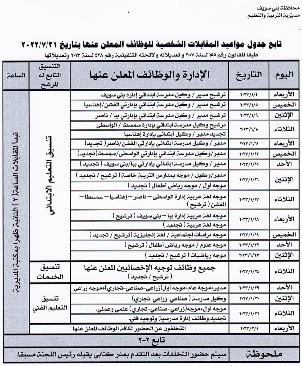 حيث أشار الأستاذ محمد عبد التواب وكيل الوزارة ، إلى متابعته لسير أعمال اللجنة المُكلفة بتقييم واختيار قيادات الإدارة المدرسية والتوجيه بمديرية التربية والتعليم لإجراء المقابلات الشخصية لشغل تلك الوظائف ، والتي بدأت " أمس الأحد" 18 ديسمبر 2022 و تستمر حتى الأول من فبراير المقبل، موضحاً أن المقابلات تهدف إلى ضخ دماء جديدة لخدمة المنظومة التعليمية واكتشاف قيادات إدارية وفنية جديدة تثري المنظومة التعليمية،مضيفاً أن اللجنة المشكلة لاختيار القيادات تمارس عملها وفق معايير المصداقية والشفافية والأمانة المهنية مع تطبيق كافة عناصر التقييم لكافة الوظائف الإشرافية والتي تتم وفق استمارة لكل مرشح طبقا للقانون 155 لسنة 2007 وتعديلاته