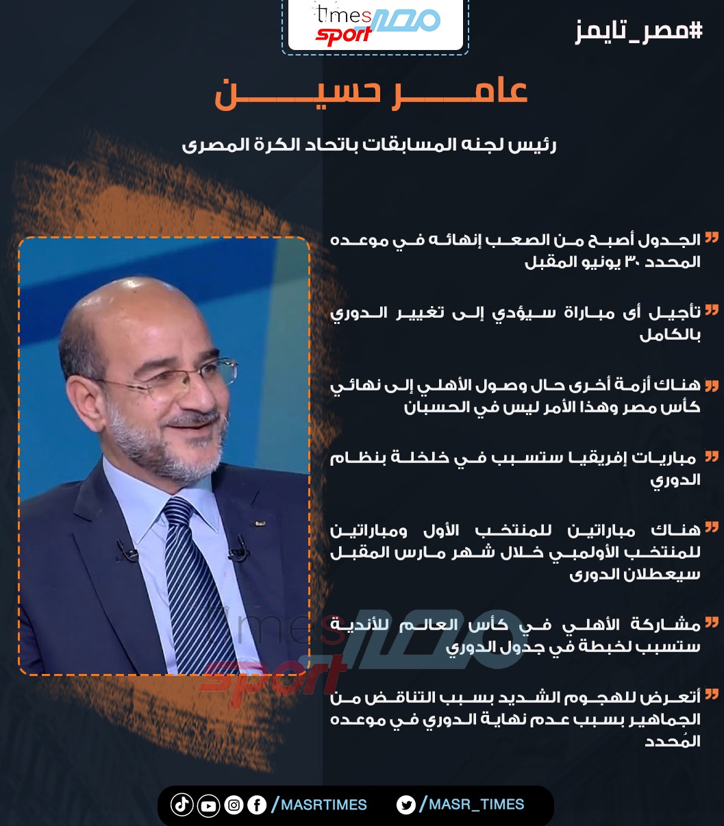 وأكد "عامر حسين" فى تصريحات إذاعية: "هناك أزمة أخرى، وهو حال وصول الأهلي إلى نهائي كأس مصر، وهذا الأمر ليس فى الحسبان أيضًا، بالإضافة لمباريات أفريقيا، كل هذا يُحدث خلخلة فى نظام الدوري، كما أنه خلال شهر مارس المقبل هناك مباراتان للمنتخب الأول ومباراتان للمنتخب الأولمبي، وبالتالى من الصعب إنهاء المسابقة كما كان محدداً لها".