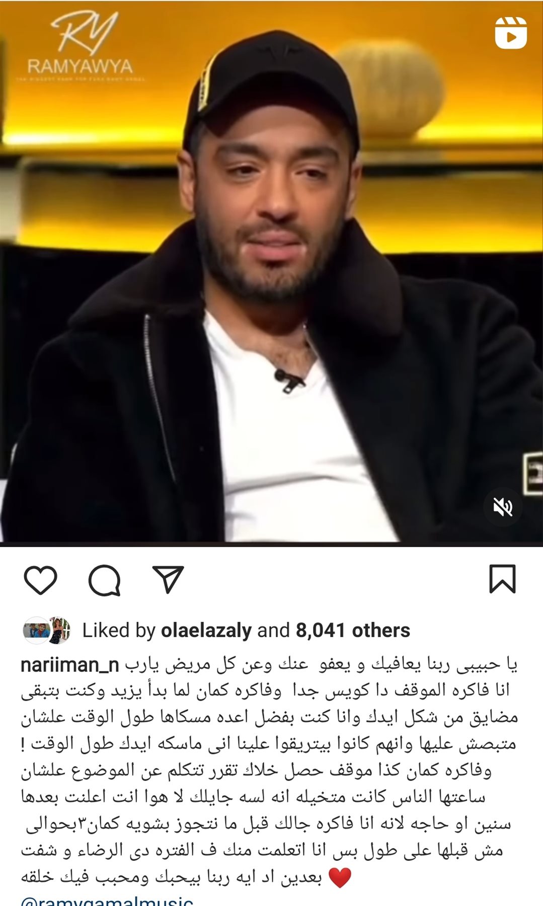 وقالت ناريمان عبر حسابها الرسمي بموقع تبادل الصور والفيديوهات "انستجرام"، معلقة على فيديو يتحدث فيه زوجها رامي جمال عن مرضه:" حبيبى ربنا يعافيك و يعفو عنك وعن كل مريض يارب انا فاكره الموقف دا كويس جدا وفاكره كمان لما بدأ يزيد وكنت بتبقى مضايق من شكل ايدك وانا كنت بفضل اعده مسكاها طول الوقت علشان متبصش عليها وانهم كانوا بيتريقوا علينا انى ماسكه ايدك طول الوقت".