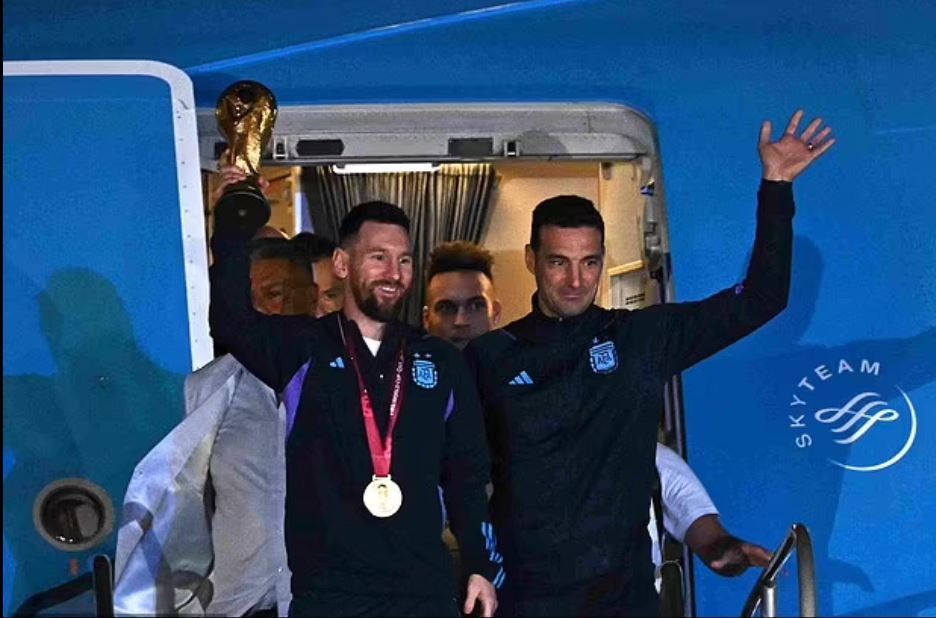 وتم استقبال بعثة منتخب الأرجنتين، بشكل رسمي، من قبل السلطات الأرجنتينية، عقب النزول من الطائرة الخاصة بهم، كما هتفت الجماهير لليونيل ميسي، قائد التانجو، فور ظهوره على سلم الطائرة، رفقة ليونيل سكالوني، المدير الفني للفريق، قائلين: "ليو ميسي أحضر لنا كأس العالم في المنزل، مرحبًا بكم في الأرجنتين، أيها الأبطال".