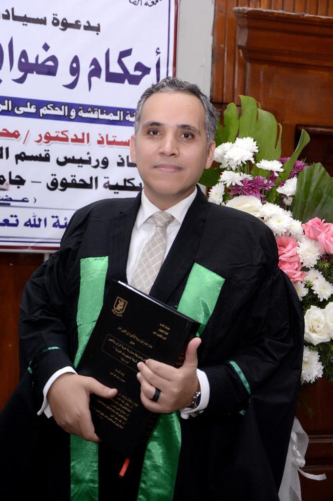 وقد حصل الباحث على درجة الدكتوراه في الحقوق بتقدير ممتاز ، وكان موضوع الرسالة يتعلق بالحق في التعبير عن الرأي في عصر تكنولوجيا المعلومات وعبر شبكة المعلومات الدولية وباستخدام وسائل التعبير الالكترونية أحد حقوق الإنسان الرقمية التي يهتم بها المجتمع الدولي في الوقت الحالي ويسعى جاهداً لحمايته دولياً .