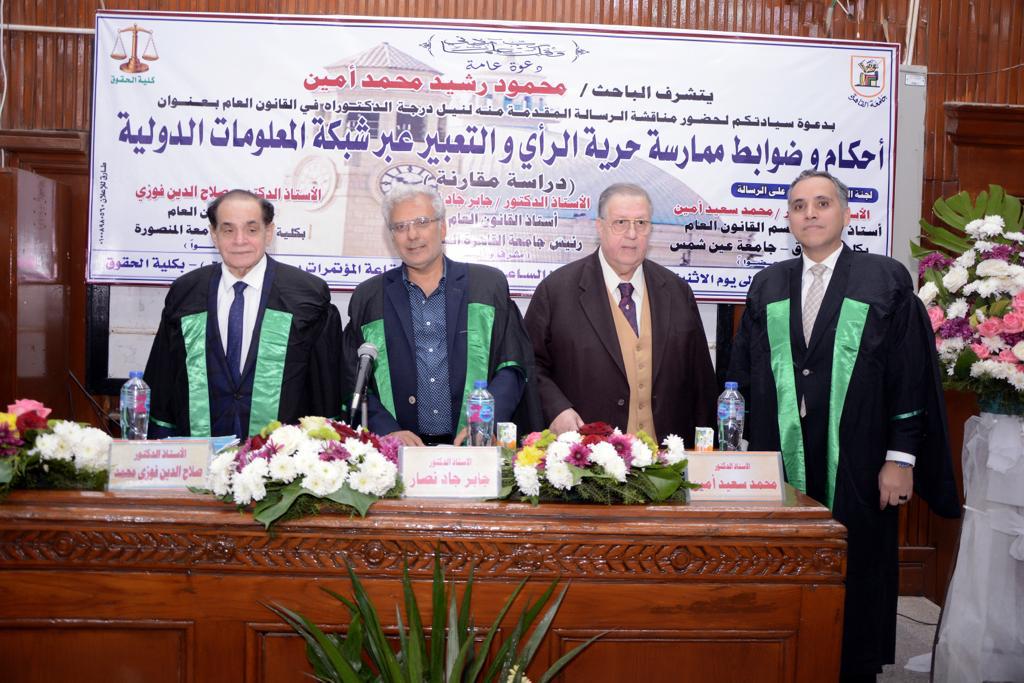 ناقش الباحث المستشار محمود رشيد محمد نائب رئيس مجلس الدولة رسالة الدكتوراه الخاصة به وعنوانها أحكام وضوابط ممارسة حرية الرأي والتعبير عبر شبكة المعلومات الدولية ـ دراسة مقارنة ، وتشكلت لجنة الحكم والمناقشة على الرسالة برئاسة الدكتور جابر جاد نصار أستاذ القانون العام ورئيس جامعة القاهرة السابق وعضوية الدكتور صلاح الدين فوزي أستاذ القانون العام بجامعة المنصورة وعضو اللجنة العليا للإصلاح التشريعي والدكتور محمد سعيد أمين أستاذ ورئيس قسم القانون العام بكلية الحقوق جامعة عين شمس .