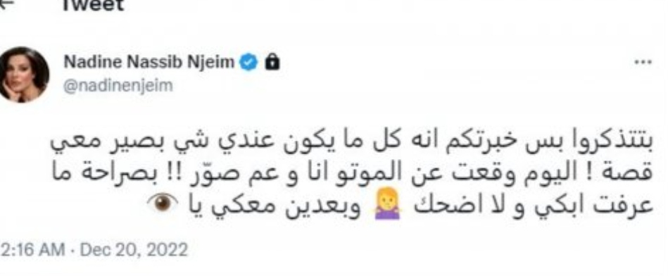 كتبت نادين نسيب نجيم، عبر صفحتها على موقع التدوينات القصيرة" تويتر " مغردة:"بتتذكرو بس ان خبرتكم أن كل ما يكون عندى شيء بصير معى قصة.. اليوم وقعت عن النوتو انا وعم صور .. بصراحة ما عرفت أبكى ولا اضحك وبعدين معاكى يا عين".