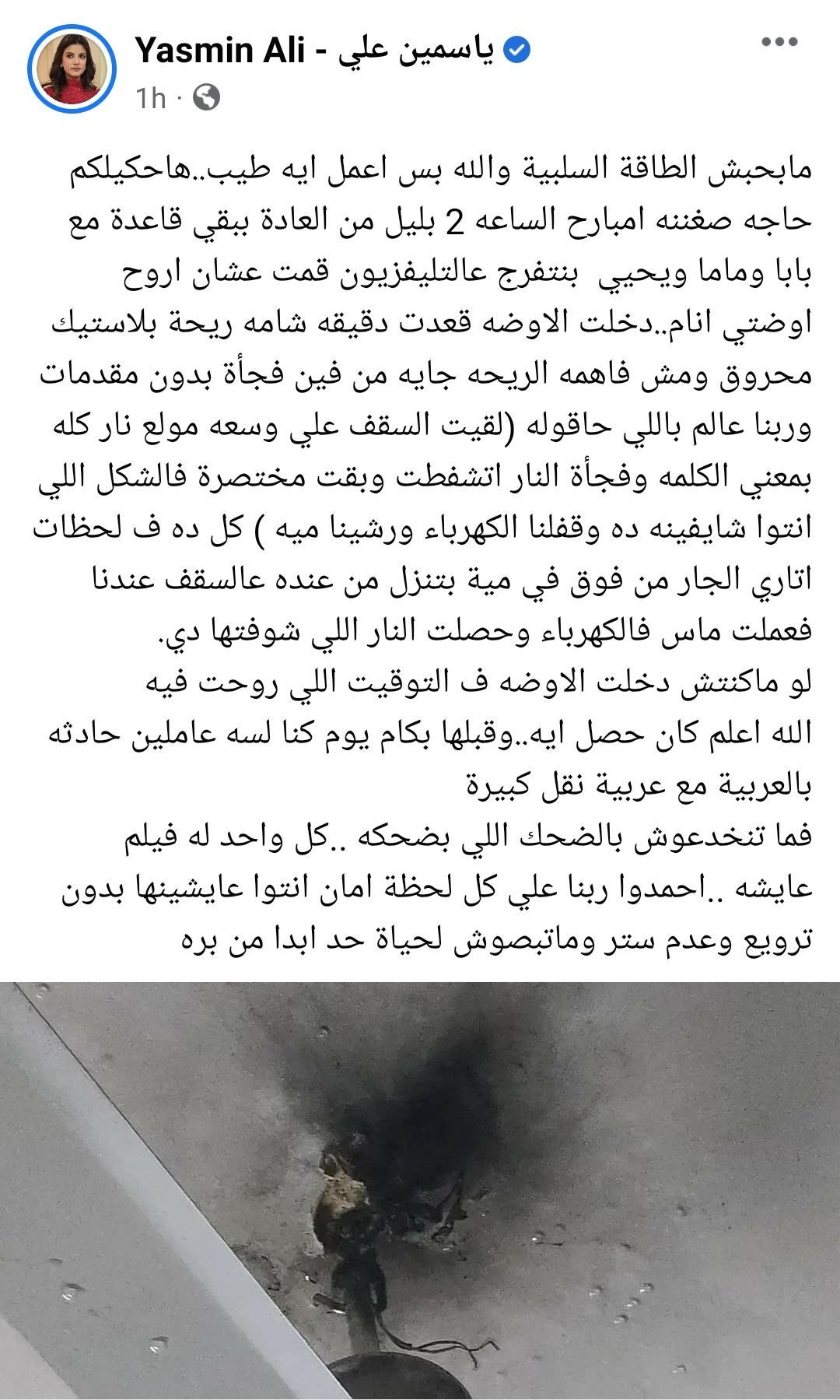 كشفت الفنانة ياسمين علي، عن حدوث ماس كهربائي في شقتها، مشيرة إلى أنها بصحة جيدة.