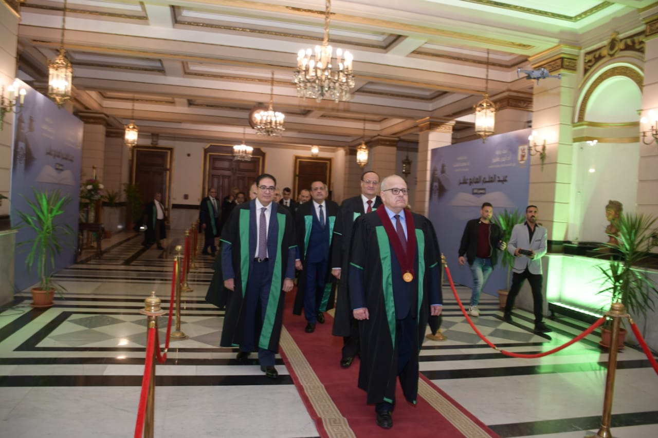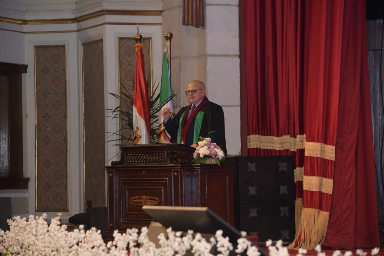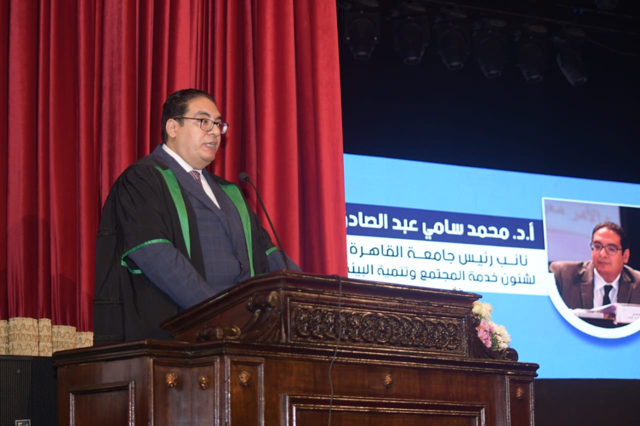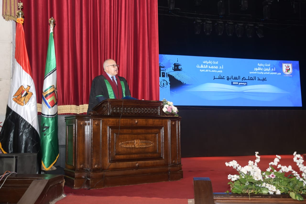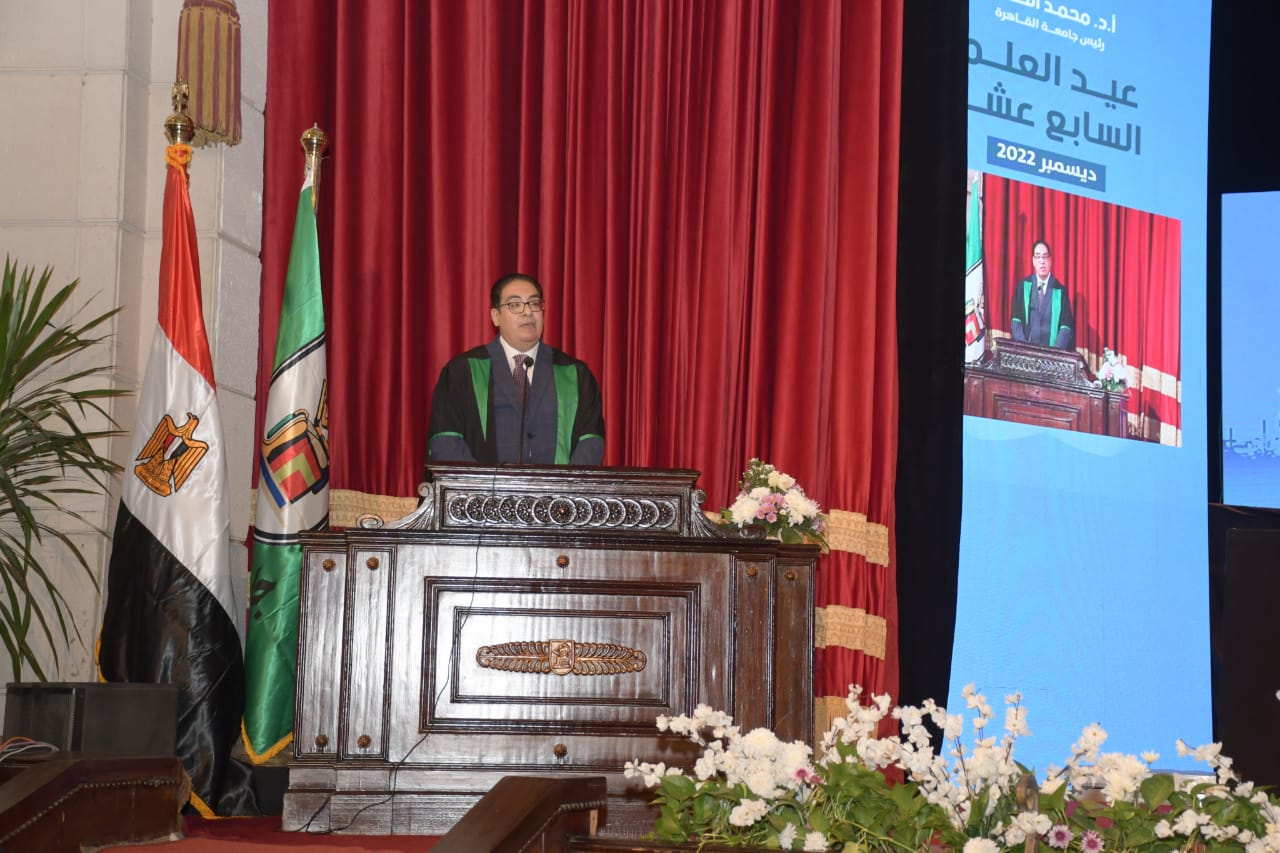 وخلال كلمته، أوضح الدكتور محمد سامي عبد الصادق نائب رئيس الجامعة لشؤون خدمة المجتمع، أن احتفالية عيد العلم بجامعة القاهرة لهذا العام تشهد تكريم 140 عالمًا من أبنائها الحاصلين على جوائز الدولة والجامعة .
