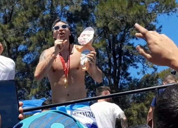 وحمل مارتينيز مجسم صغير لطفل ووضع عليه صورة مبابى، وذلك خلال تواجده فى الحافلة المكشوفة للمنتخب الأرجنتينى في شوارع العاصمة بوينس آيرس فى حضور الملايين من الجماهير.