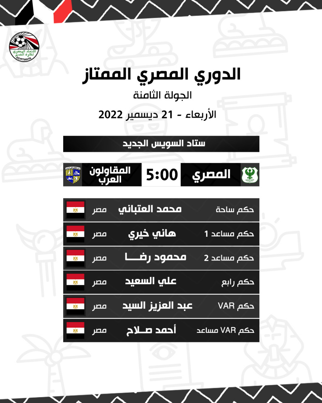 أعلنت لجنة الحكام باتحاد الكرة، عن أسماء حكام مباراة المصري البورسعيدي والمقاولون العرب، التي تقام فى الخامسة مساء غد الأربعاء باستاد السويس الجديد، ضمن منافسات الجولة الثامنة في بطولة الدوري المصري الممتاز.