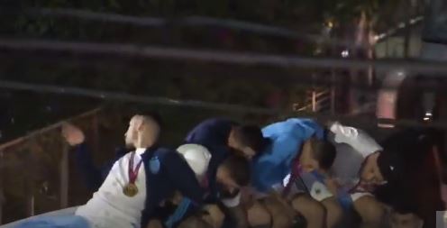 وغنى المشجعون السعداء على إيقاع الطبول وأضاءت الألعاب النارية السماء، بينما كانت الحافلة تشق طريقها ببطء بين الجماهير.