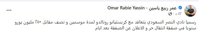 ونشر عمر ربيع ياسين عبر صفحته الرسمية بموقع "فيس بوك": رسميا نادي النصر السعودي يتعاقد مع كريستيانو رونالدو لمدة موسمين و نصف مقابل 250 مليون يورو سنويا في صفقة انتقال حر و الاعلان عن الصفقة بعد ايام.