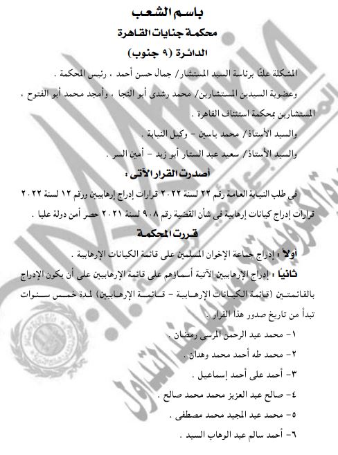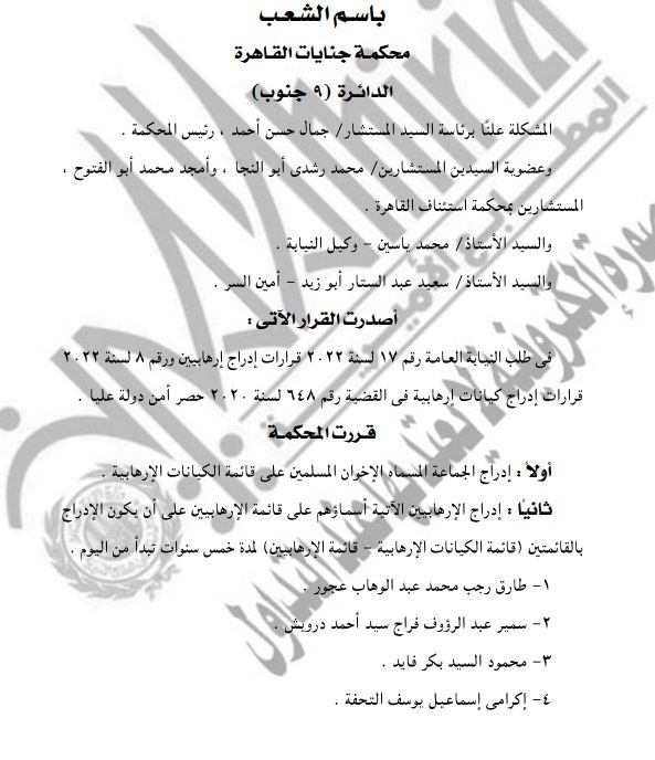 وفيما نشرت الجريدة الرسمية، قرار الدائرة 9 بمحكمة جنوب القاهرة، في طلب النيابة رقم 22 لسنة 2022، قرارات إدراج إرهابيين رقم 12 لسنة 2022، قررت إدراج كيانات إرهابية، بإدراج جماعة الإخوان على قوائم الإرهاب، وإدراج 21 متهما على قوائم الإرهاب لمدة 5 سنوات.