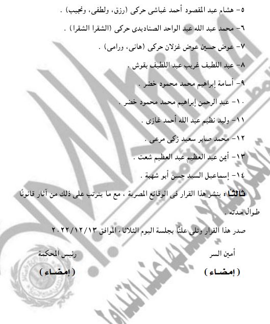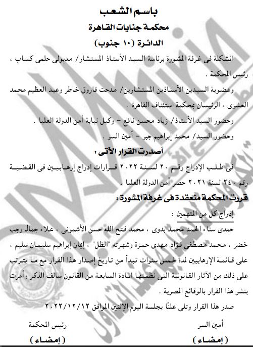 كما نشرت الجريدة الرسمية قرار الدائرة 10 بمحكمة جنايات جنوب القاهرة، برئاسة المستشار مدبولى كساب، في طلب الإدراج رقم 20 لسنة 2022، قرارات إدارج إرهابيين في القضية رقم 240 لسنة 2021 حصر أمن دولة العليا، بإدراج 7 متهمين على قوائم الإرهابيين.