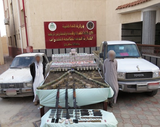 ضبط (شخصين- مقيمان بدائرة قسم شرطة الضبعة) حال تواجدهما بدائرة القسم.. وبحوزتهما (1490 طربة لمخدر الحشيش وزنت 203 كيلو جرامات، 66 ألف قرص مخدر لعقار "ترامادول"- 3 بنادق آلية و 6خزائن وعدد من الطلقات النارية لذات العيار- سيارتين- مبلغ مالى- 4 هواتف محمولة).
