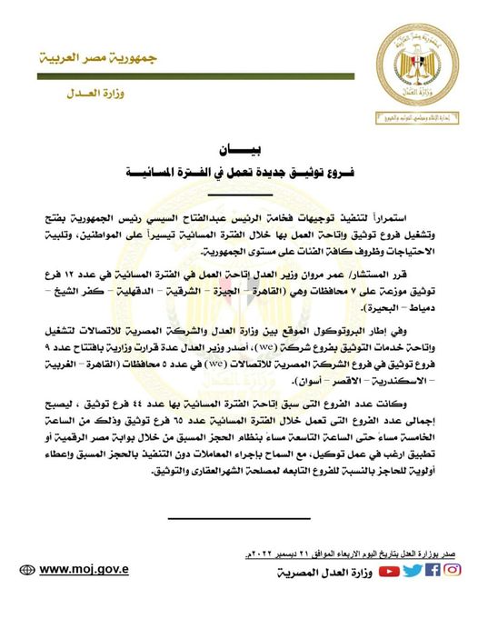 قرر المستشار عمر مروان وزير العدل إتاحة العمل في الفترة المسائية في عدد 12 فرع توثيق موزعة على 7 محافظات وهي القاهرة ، الجيزة ، الشرقية ، الدقهلية ، كفر الشيخ ، دمياط ، البحيرة.