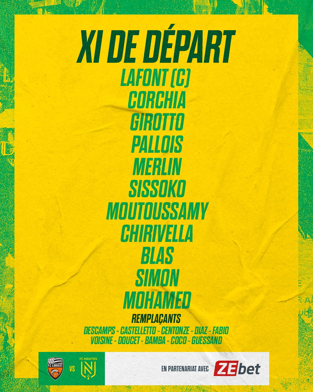 أعلن أنطوان كومباريه المدير الفني لفريق نانت الفرنسي، عن تشكيل فريقة في المواجهة الودية ضد نظيره فريق لوريان، المقرر لها فى تمام السابعة والنصف من مساء اليوم الأربعاء، ضمن استعدادات عودة منافسات الدوري الفرنسي.