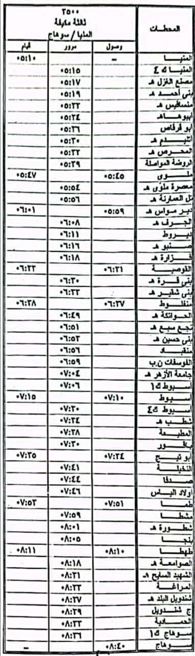 - قطار 3501 يقوم من سوهاج الساعة 2:30 مساءًا يصل المنيا الساعة 6:05 مساءًا بتركيب (عدد 8 عربات ثالثة مكيفة + عربة بوفية تهوية ديناميكية + عربة قوى)، والهيئة تسعى دائمًا لتقديم أفضل خدمة لجمهور الركاب.