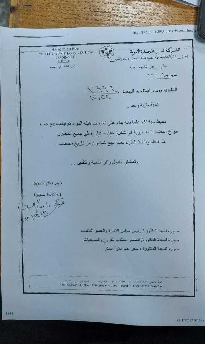 وأوضح نص خطاب صادر من الشركة المصرية لتجارة الأدوية احدى الشركات التابعة للشراء الموحد والامداد الطبي لرؤساء القطاعات البيعية، بتنفيذ تعليمات هيئة الدواء المصرية بوقف بيع المضادات الحيوية للمخازن.