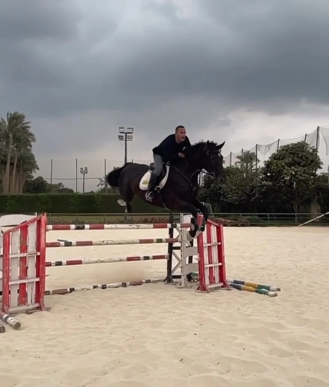 وظهر أحمد السقا وهو يعتلى حصانه ويقوم بقفز أحد الحواجز بطريقة إحترافية، ويشيد بلياقة حصانه بعد القفزة قائلا: "أفضل مدرب علي الإطلاق ما شاء الله".