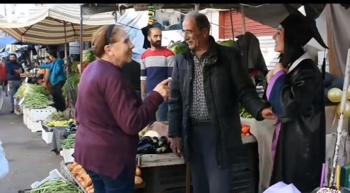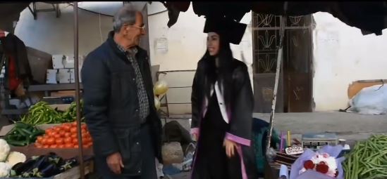 وظهرت الفتاة السورية بملابس تخرجها بعد انتهاء حفلة تخرجها وذهبت لمحل عمل والدها "بائع الخضار" لتحتفل مع وسط أصدقائه ومعها تورتة كتبت عليها" بابا أعظم شهاداتي "