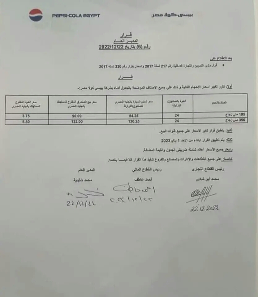 قررت شركة بيبسي كولا مصر، المنتجة لمشروبات بيبسي، رفع أسعار أحد أصناف المياه الغازية بداية من يناير 2023.