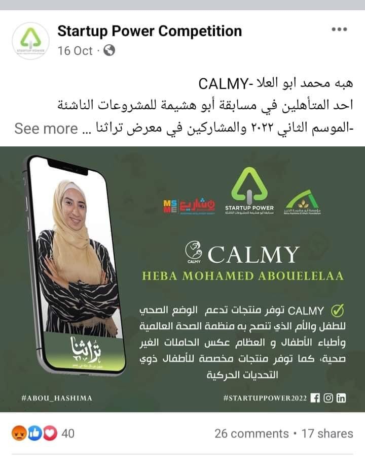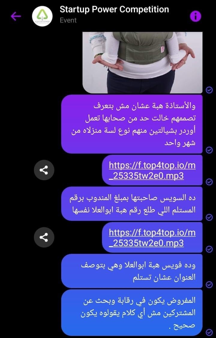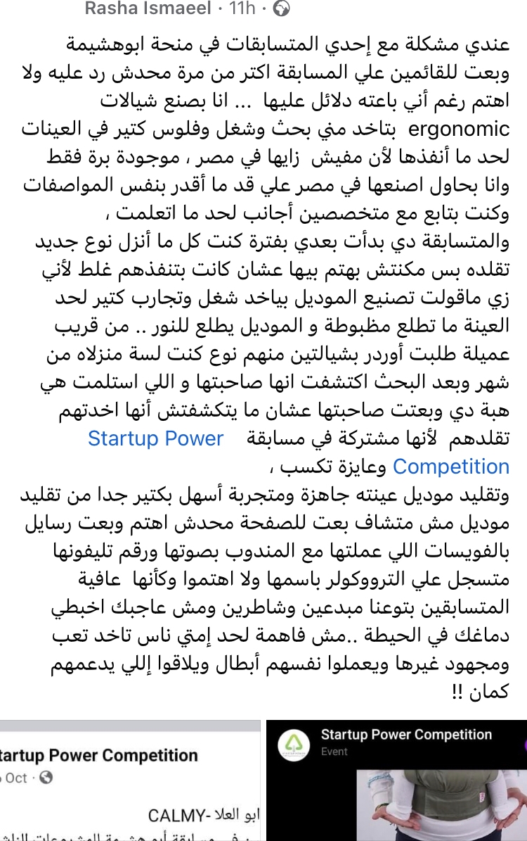 وقالت السيدة،"عندي مشكلة مع إحدي المتسابقات في منحة ابوهشيمة وبعت للقائمين علي المسابقة اكتر من مرة محدش رد عليه ولا اهتم رغم أني باعته دلائل عليها ... انا بصنع شيالات ergonomic بتاخد مني بحث وشغل وفلوس كتير في العينات لحد ما أنفذها لأن مفيش زايها في مصر ، موجودة برة فقط وانا بحاول اصنعها في مصر علي قد ما أقدر بنفس المواصفات وكنت بتابع مع متخصصين أجانب لحد ما اتعلمت ، والمتسابقة دي بدأت بعدي بفترة كنت كل ما أنزل نوع جديد تقلده بس مكنتش بهتم بيها عشان كانت بتنفذهم غلط لأني زي ماقولت تصنيع الموديل بياخد شغل وتجارب كتير لحد العينة ما تطلع مظبوطة و الموديل يطلع للنور .. من قريب عميلة طلبت أوردر بشيالتين منهم نوع كنت لسة منزلاه من شهر وبعد البحث اكتشفت انها صاحبتها و اللي استلمت هي هبة دي وبعتت صاحبتها عشان ما يتكشفتش أنها اخدتهم تقلدهم لأنها مشتركة في مسابقة Startup Power Competition وعايزة تكسب ".