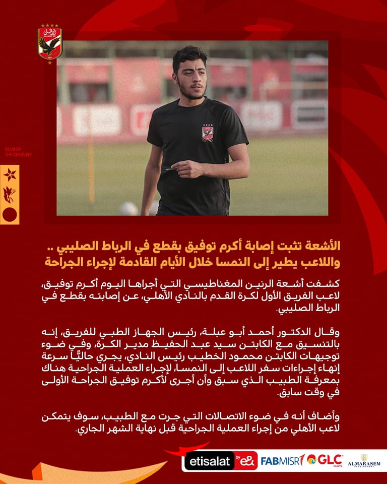 وتعرض أكرم توفيق لإصابة في مران الفريق أمس ، السبت، ولم يُعلن الأهلي عن التشخيص النهائي لإصابة اللاعب لكن الفحوصات الأولية أثبتت إصابته بقطع جزئي في الرباط الصليبي.