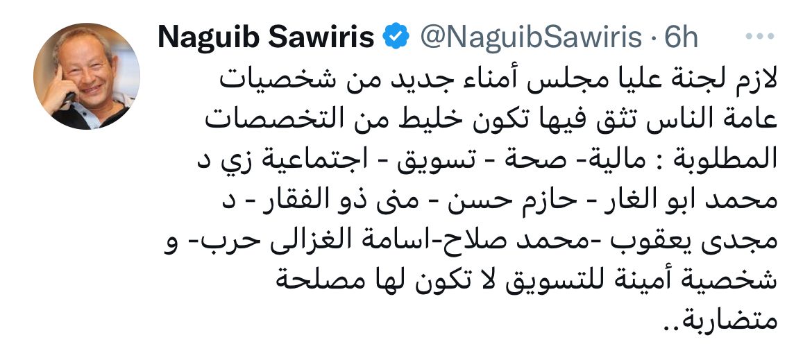 وقال نجيب ساويرس ، "لازم لجنة عليا مجلس أمناء جديد من شخصيات عامة الناس تثق فيها تكون خليط من التخصصات المطلوبة : مالية- صحة - تسويق - اجتماعية زي د محمد ابو الغار - حازم حسن - منى ذو الفقار - د مجدى يعقوب -محمد صلاح-اسامة الغزالى حرب- و شخصية أمينة للتسويق لا تكون لها مصلحة متضاربة".