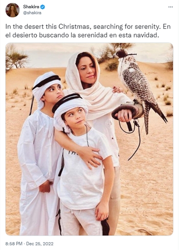وظهرت شاكيرا وهي تحمل طائر جارح على يدها مرتدية غطاء الرأس بينما يرتدي أبنائها العقال العربي فوق رؤوسهم وعلقت شاكيرا على الصورة " في الكريسماس نتواجد بالصحراء نبحث عن الصفاء".