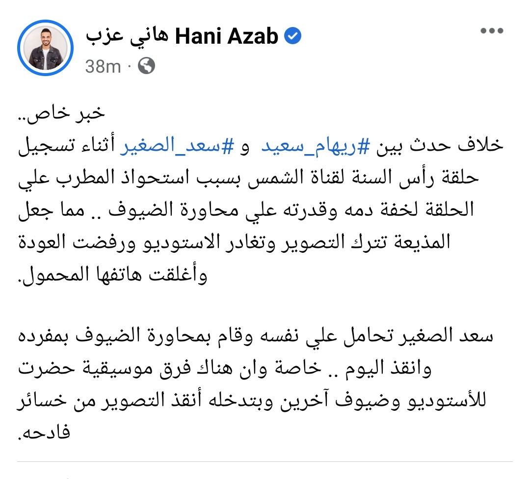 وكتب هاني عزب عبر صفحته على موقع التواصل الاجتماعي الفيسبوك:"خلاف حدث بين ريهام سعيد، وسعد الصغير أثناء تسجيل حلقة رأس السنة لقناة الشمس بسبب استحواذ المطرب علي الحلقة لخفة دمه وقدرته علي محاورة الضيوف".