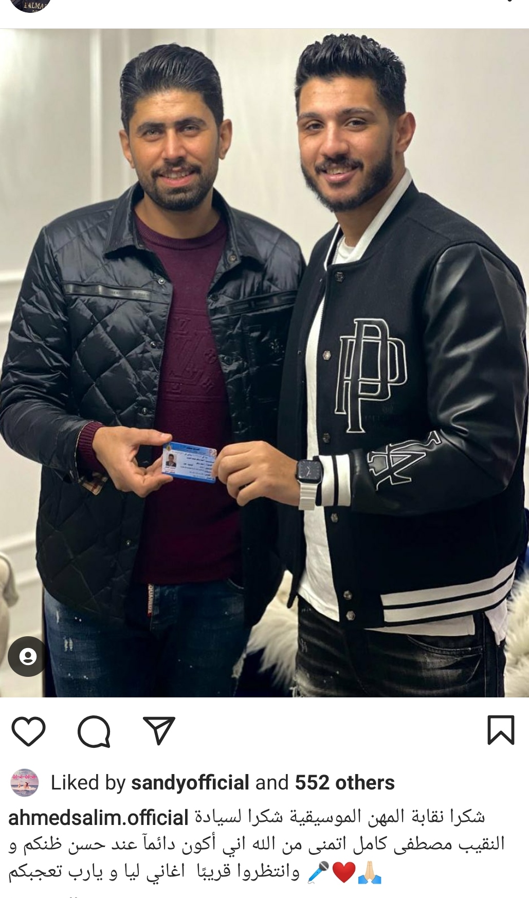 ونشر أحمد سالم، عبر حسابه في موقع تبادل الصور والفيديوهات إنستجرام صورة له بالكارنيه النقابة، وعلق عليها: "شكرا نقابة المهن الموسيقية شكرا لسيادة النقيب مصطفى كامل اتمنى من الله اني أكون دائمآ عند حسن ظنكم وانتظروا قريبًا اغاني ليا و يارب تعجبكم".