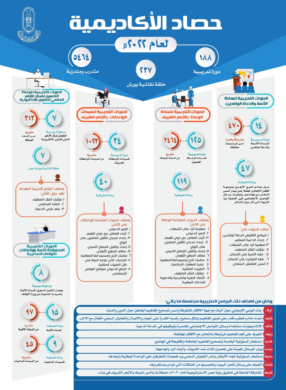 وخلال عام 2022 قامت أكاديمية الأزهر بأنشطة مكثفة ومتنوعة في إطار دورها الدعوي والتدريبي والتعليمي وتأهيل الوعاظ والواعظات وأعضاء لجان الفتوى والدعاة والأئمة من داخل مصر وخارجها، حيث نظمت أكاديميةُ الأزهر العالمية خلال عام 2022 (188) دورةً تدريبيةً في مجالاتٍ متنوعةٍ، و (237) حلقة نقاشية وورش عمل، شاركَ فيها (5414) متدرباً ومتدربة من الوعاظ والواعظات بالأزهر الشريف، والأئمة والسيدات الداعيات بوزارة الأوقاف، ةالأئمة والدعاة الوافدين من خارج مصر.