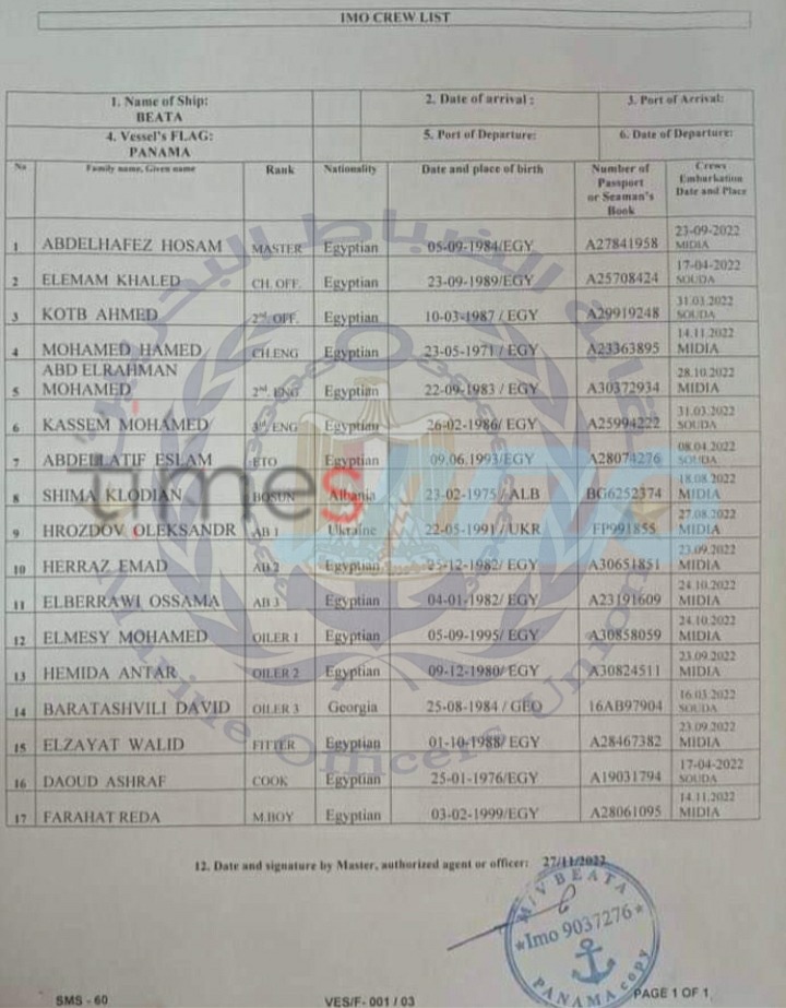 حصل "مصر تايمز" علي ما يطلق عليه الـ "كروليست" الخاص بسفينة BEATA التي تعرضت للانفجار في البحر الأسود.