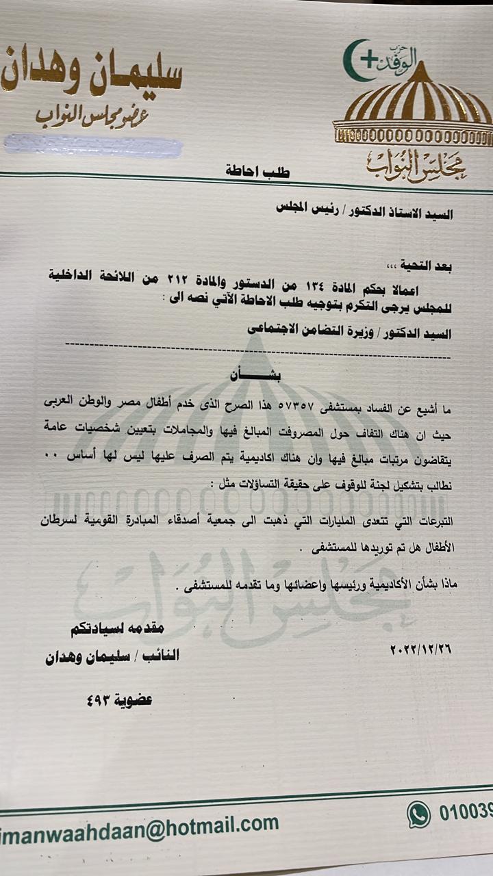 تقدم النائب سليمان وهدان، نائب رئيس حزب الوفد،وعضو مجلس النواب، إلى المستشار الدكتور حنفي جبالي، رئيس المجلس، بطلب إحاطة موجه إلى وزيرة التضامن الدكتورة نيفين القباج، بشأن ما أثير عن وجود وقائع فساد بمستشفي 57357.